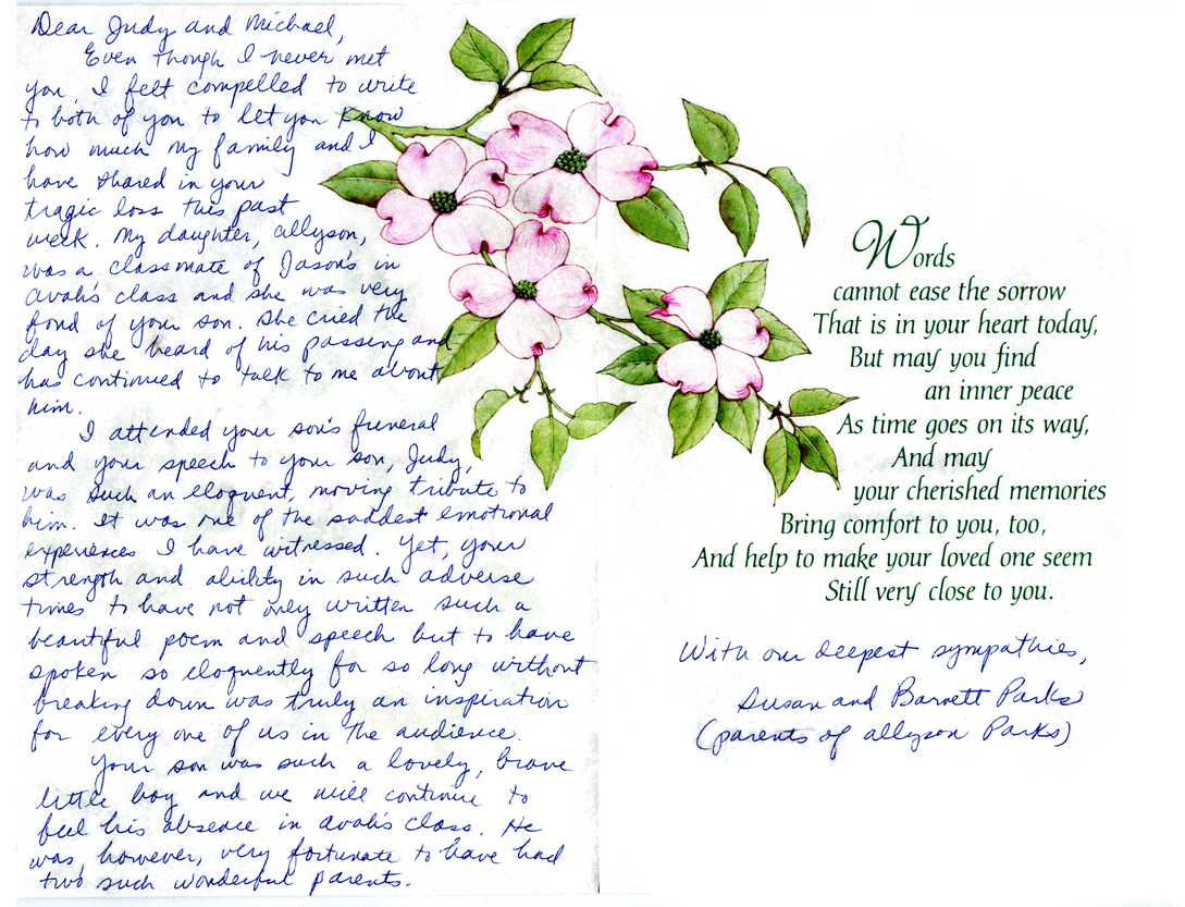 I don’t know where to begin to thank you. I have the card you sent me in a very special place because it touched me to tears every time I read it. You helped so much even bringing me that book for Jeffrey and with food. Most of all, I am so touched by your sensitivity. You are truly a special woman and what a way to make an acquaintance. Out of this horrible vacuum of Jason’s death, I see so many wonderful things. Your compassion is part of that, and I will never forget your caring.