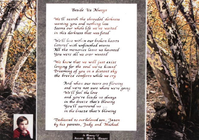 My little freckle-faced boy named Jason was the most precious thing that could have been taken from me. Sometimes, I envision a parable to describe the horror. I once lived in innocence and I was rich beyond belief because I had a precious jewel. I polished and took such good care of it until the day it was stolen from me. Now, although I’ve been entrusted to care for other precious jewels – I no longer am relaxed to polish and care for them. As valuable as they are to me, I now live in constant fear that they too, will be taken. How I wish I could feel innocent again!