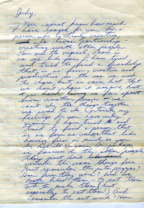 You know I say I’m not going to let myself get hurt again. But I’m hurting right now with apprehension. What can I do? I’m so vulnerable and I won’t stop myself from having the fun of a girlfriend like her. I guess the future will happen. And I will meet someone to take her place. But that will only be done with effort and time on my part – and I will devote to it. Judy, are you a fool? A lesbian, I’m not, but I feel strange. I sure wish she moved away or died . . .