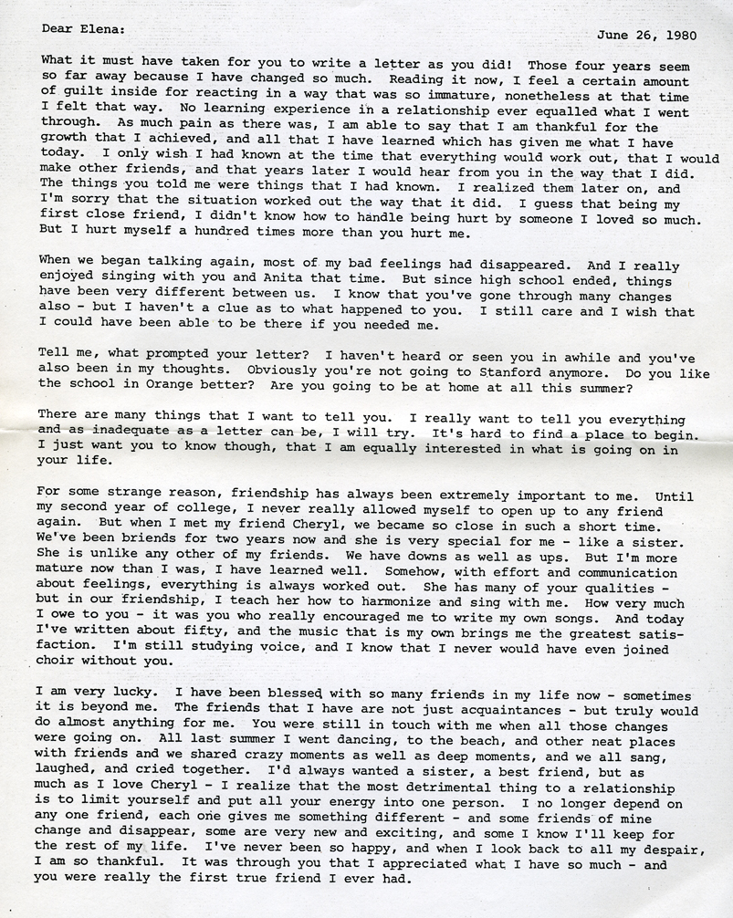 Now for a final and last shock: I received a letter from Elena – yes, Elena if you can believe it. And now, strangely, four years later I receive an apology from her. Can you believe it? When I think of all the pain I went through – she was my world. And she was everything to me. I thought she didn’t care. And now I find out – she felt horrible without our friendship. She had cared all along without ever letting me know. How can I forgive her for that? If she had only let me know – maybe, even with my stubborn sensitivity we could have worked things out.