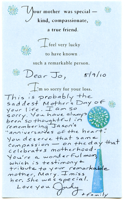 Mother’s Day is a very painful day for someone mourning the loss of his or her mother. I haven’t gone through that door yet – I cannot speak to the pain. It will be my sister-in-law’s first one without her mother. Therefore, I have already found a special card to send her.