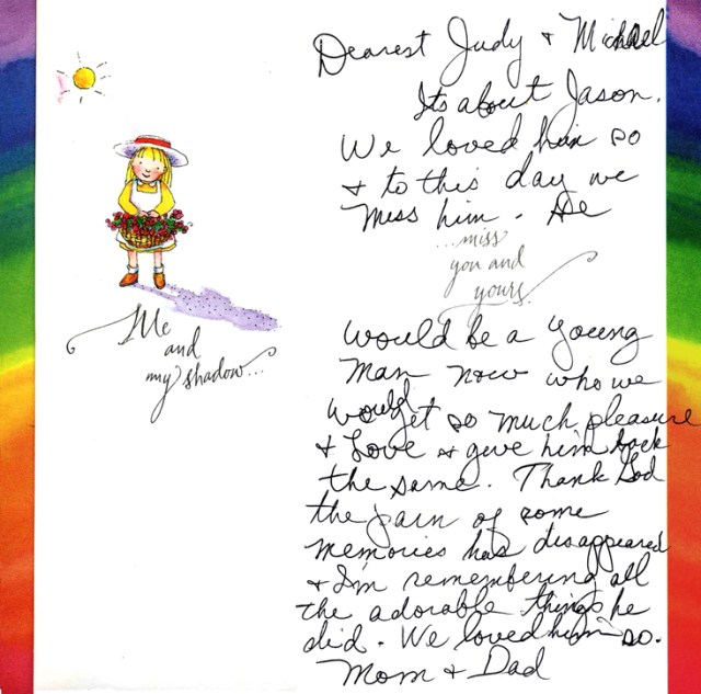 As I have begun writing this blog, I have delved into many areas of my past. I’ve sorted through many of my advocacy letters, as well as the speeches for important occasions. The most difficult thing for me to write was Jason’s eulogy because I only had a brief moment to summarize my dead child’s life. I was writing while in a state of shock and numbness.