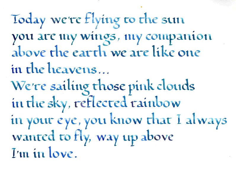 While I was in college, I took a calligraphy class. I created a book using my lyrics for one of my class assignments. I’ve enjoyed “sprinkling” some of those calligraphy pages throughout my blog. Below is the cover for my book: