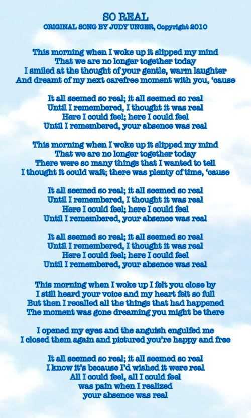 Sleep was a blessed escape from the anguish of grief – and that was if I was even so fortunate as to fall asleep. My song, So Real, is about waking up to the awareness of what is unbearable to face. I did not want to wake up! I would lie in bed, wishing my life were over. I begged for relief from the anguish and wondered why I had to live with that level of pain. It seemed endless and I never thought it would change.