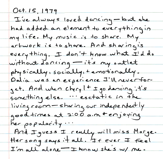 When I say on the cassette that it might make her cry, it is not with an inflated ego about my songs moving her. It is about the fact that I interviewed her parents on side two of the tape. I also carried a tape recorder with me to a folk-dancing venue and had many other friends say words to her, as well.