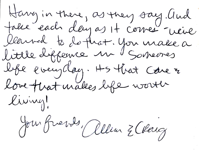 Although I am tired, I want to write about my lunch today seeing Lori and Allison. Both women looked absolutely wonderful; neither had changed at all – in fact all three of us looked radiant in comparison to those times where we carried the heavy load of grief.