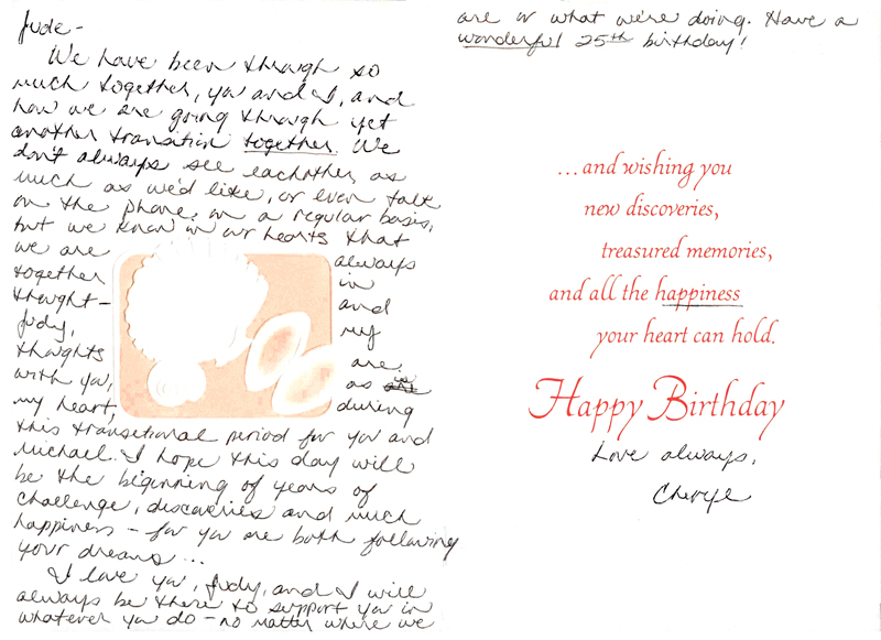 We have been through so much together, you and I, and now we are going through yet another transition together. We don’t always see each other as much as we’d like, or even talk on the phone on a regular basis, but we know in our hearts that we are always together in thought – and Judy, my thoughts are with you, as is my heart, during this transitional period for you and Michael. I hope this day will be the beginning of years of challenge, discoveries and much happiness – for you are both following your dreams . . .