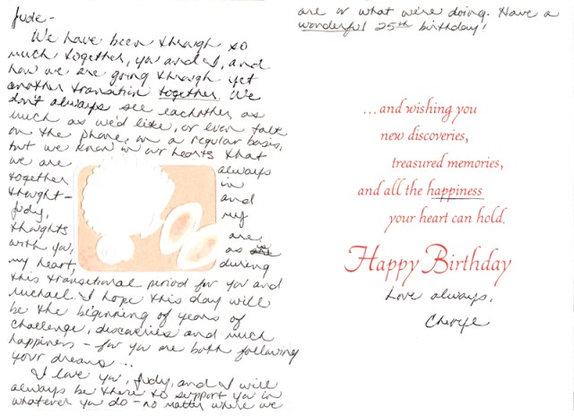 I love you, Judy, and I will always be there to support you in whatever you do – no matter where we are or what we’re doing. Have a wonderful 25th birthday!