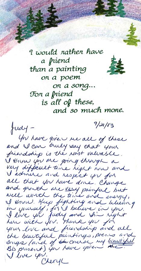 You have given me all of these and I can truly say that your friendship is the most valuable. I know you are going through a very difficult time right now and I admire and respect you for all that you have done. Change and growth are very painful but well worth the time and energy, I know. Keep fighting and believing in yourself, for I believe in you. I love you, Judy, and I’m right here with you. Thank you for your love and friendship and all the beautiful paintings, poems, and songs (and of course, my beautiful BD present) you have given me. I love you.