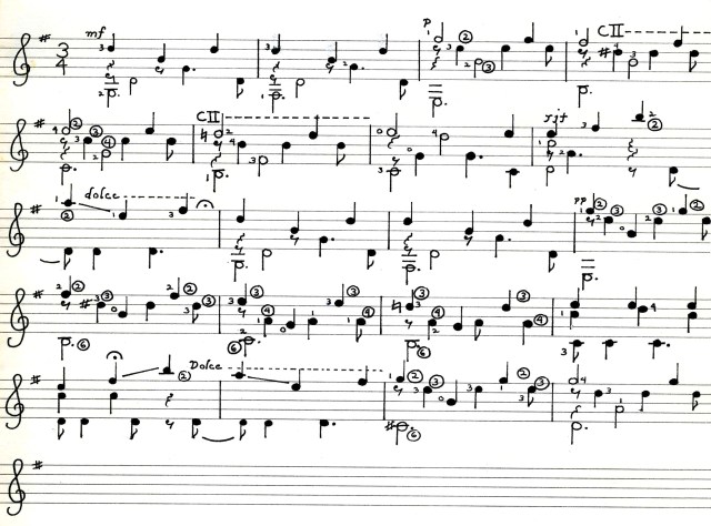 For the arranged version, I played my steel string guitar. It felt different as I began to play the same progressions of notes. The sound was like bells – “tinny” and sweet, for sure. I played over an over until I decided the song was close enough. My technical virtuosity began to improve two weeks ago when I concentrated on remembering this piece again after thirty years.