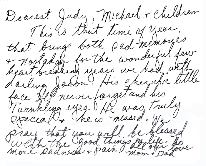 This is that time of year that brings both sad memories and nostalgia for the wonderful few heartbreaking years we had with darling Jason. His cherubic, little face I’ll never forget and his twinkling eyes. He was truly special and he is missed. We pray that you will be blessed with the good things in life. No more sadness and pain.