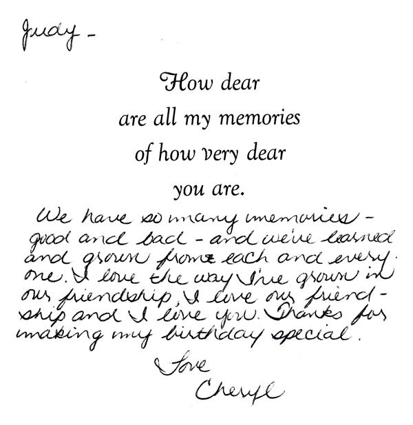 In April of this year, I wrote about my close friendship with Cheryl. At that time, I shared my original lyrics to my song, “Just a Tune.” I also arranged this special song for her. Clicking the blue link below plays my song: