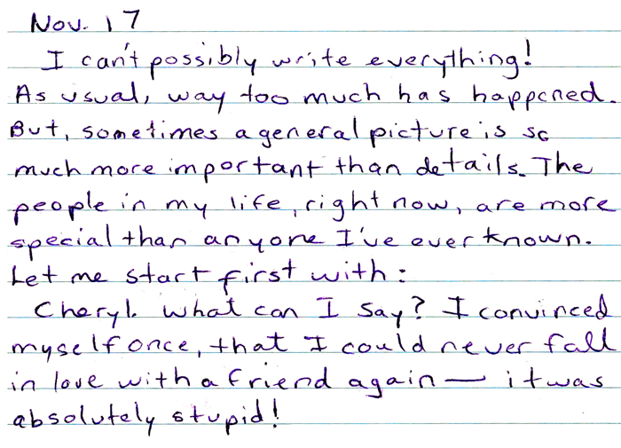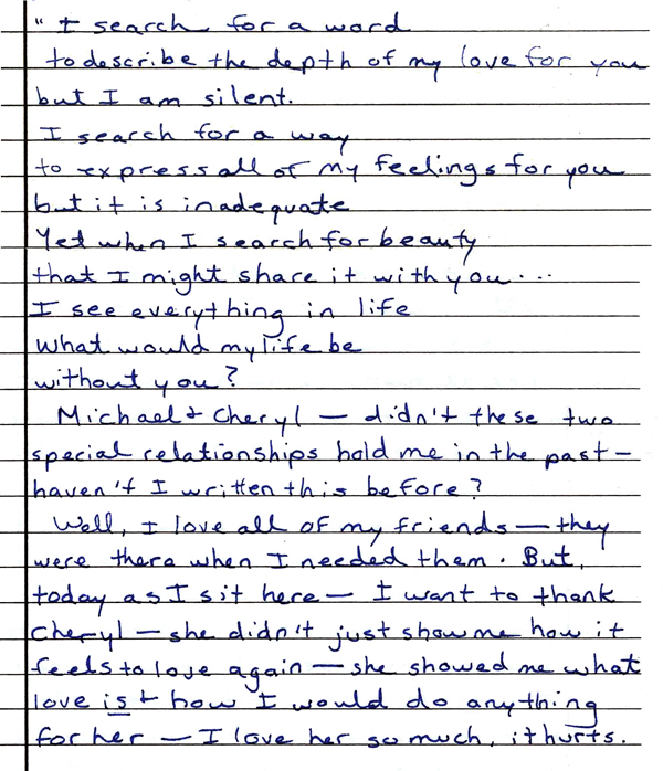Cheryl was very close with me during the time that I was intensely writing many of my songs. She inspired me on at least five of my songs. This song would be the song that was clearly the one I most considered a special gift to her.
