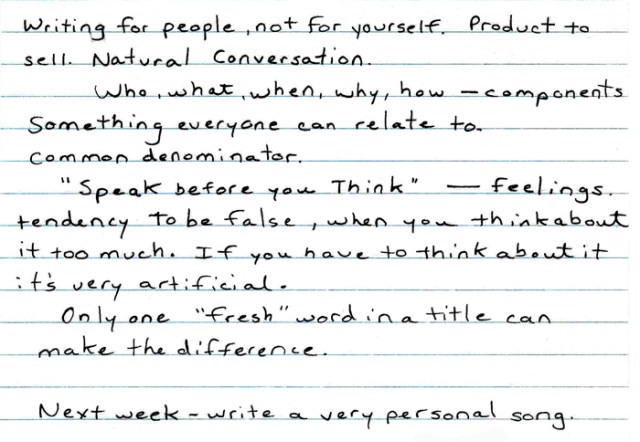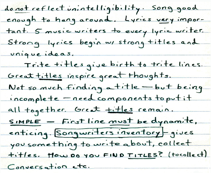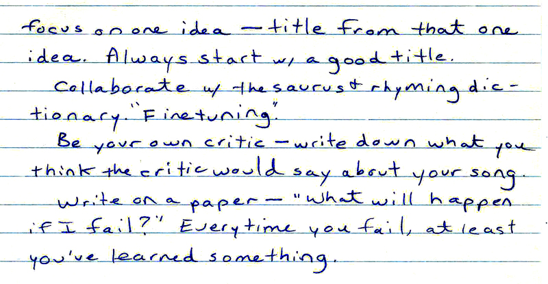 I am sharing what I have been writing. I’m sure it will evolve some more – good lyrics involve a lot of rewriting. The title isn’t set for me at all. Following those lyrics, I am attaching the rest of my songwriting workshop notes.