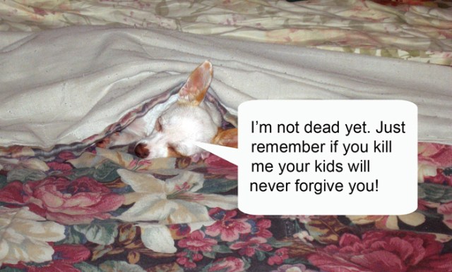 Our little dog got even with me the next day. My oldest son came to me breathless and informed me, “Mom! I asked you to make sure Killer stayed away from my dinner! He ate my burrito! Why did you leave it on the dining room table?”