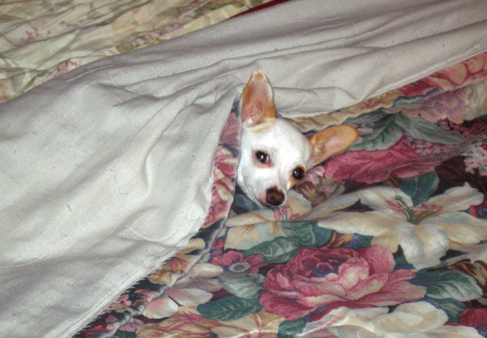 Today for some reason, my mood is lighter. My humor has returned. The other day I caught our adorable Chihuahua, named Killer, peeking out from under a bedspread – right near where my pillow was. I took his picture.