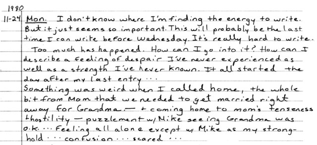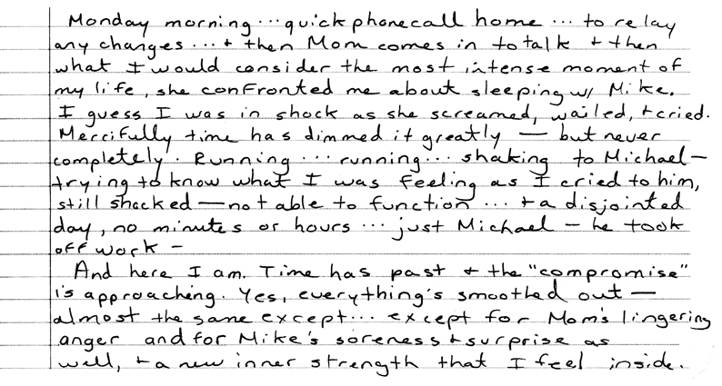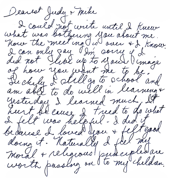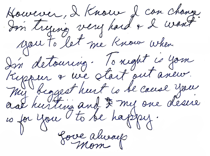 I could not write until I knew what was bothering you about me. Now the meeting is over and I know. I can only say I’m sorry if I did not live up to your image of how you want me to be. Luckily, I still go to school and am able to do well in learning and yesterday I learned much. It hurt because I tried to do what I felt was helpful. I did it because I loved you and felt good doing it. Naturally I fell my moral and religious principles are worth passing on to my children. However, I know I can change. I’m trying very hard and I want you to let me know when I’m detouring. Tonight is Yom Kippur and we start out anew. My biggest hurt is because you are hurting and my one desire is for you to be happy. Love, Mom