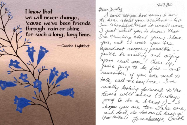 I don’t usually share the card covers, but this one was special. I used to play that song by Gordon Lightfoot. Carol sent me this one. Clicking on this makes it larger.