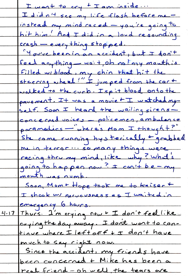 In 1980, I was in a car accident about a block from my home. It was a painful experience for me at that time in my life. However, it was not a huge trauma compared to later events in my life!