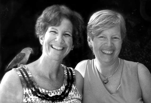Before Carol left in the later afternoon, my daughter took some pictures of us. Unfortunately, the lighting wasn’t very good and the color was washed out. My Photoshop skills couldn’t rescue them much, and I ended up going to black and white in order for the photo to be appreciated. RIght after taking the photo with Tiki on my shoulder, that cantankerous bird was jealous of Carol and bit me instead on the neck!
