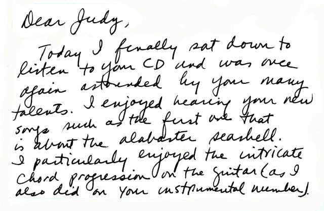 Today I finally sat down to listen to your CD and was once again astonished by your many talents. I enjoyed hearing your new songs, such as the first one that is about the alabaster seashell. I particularly enjoyed the intricate chord progression on the guitar (as I also did on your instrumental number).