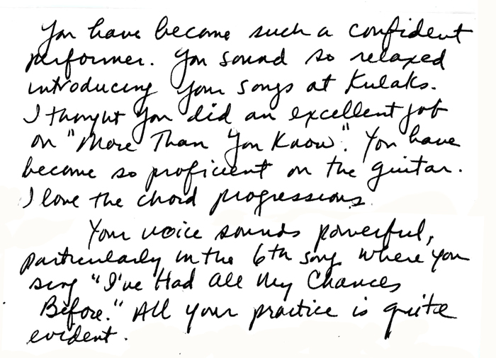 You have become such a confident performer. You sound so relaxed introducing your songs at Kulak’s. I thought you did an excellent job on “More Than You Know.” You have become so proficient on the guitar. I love the chord progressions.