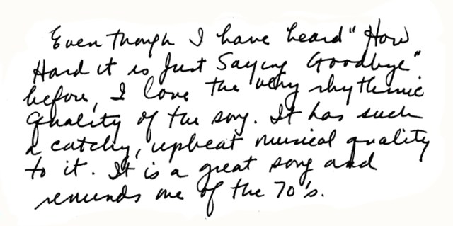 Even though I have heard “how hard it is Just Saying Goodbye” before, I love the very rhythmic quality of the song. It has such a catchy, upbeat musical quality to it. It is a great song and reminds me of the 70’s.