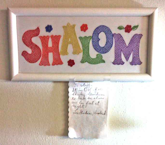 Then he pointed to a sign on the wall. The sign said, “It is okay for Shirley Goodman to leave her shoes on her feet at night.”