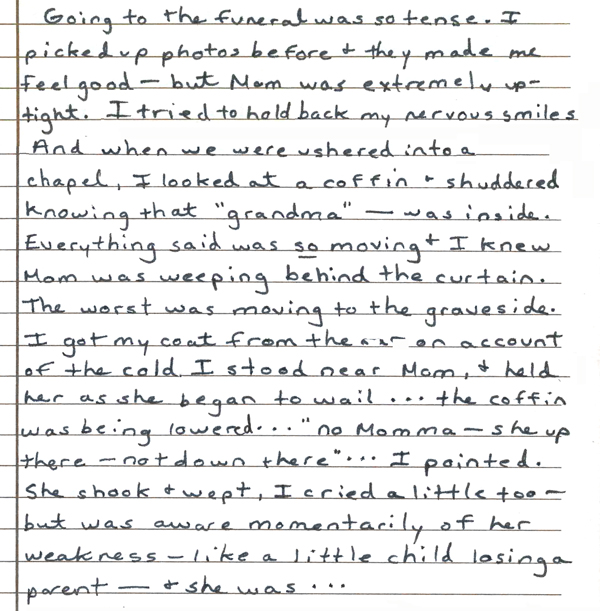 When I opened and read my teenage diary thirty years later, I copied a page about the experience of seeing my mother’s grief at my grandmother’s funeral.