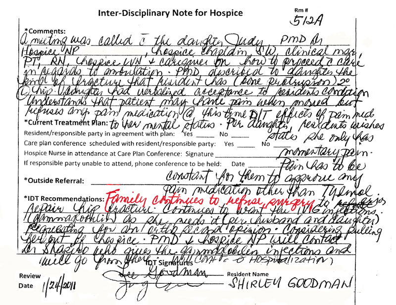 There was a lot of discussion about pain medication. The general opinion was that my mother definitely needed stronger painkillers to address her pain. When my mom has been on any painkiller in the past, she has become extremely disoriented, agitated, or immobile. I explained this.
