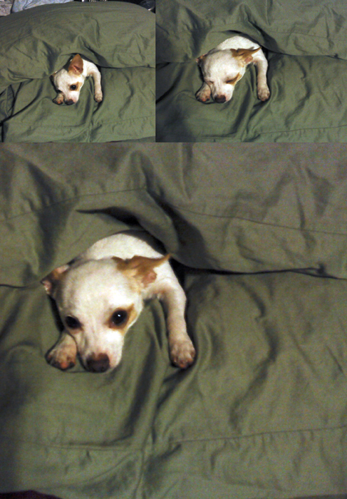 I almost killed our dog last night; I turned on the light and had to take this picture. He was peeking out from under one of my pillows. Sometimes I just “crash” into my bed in the dark. It wouldn’t have been good!
