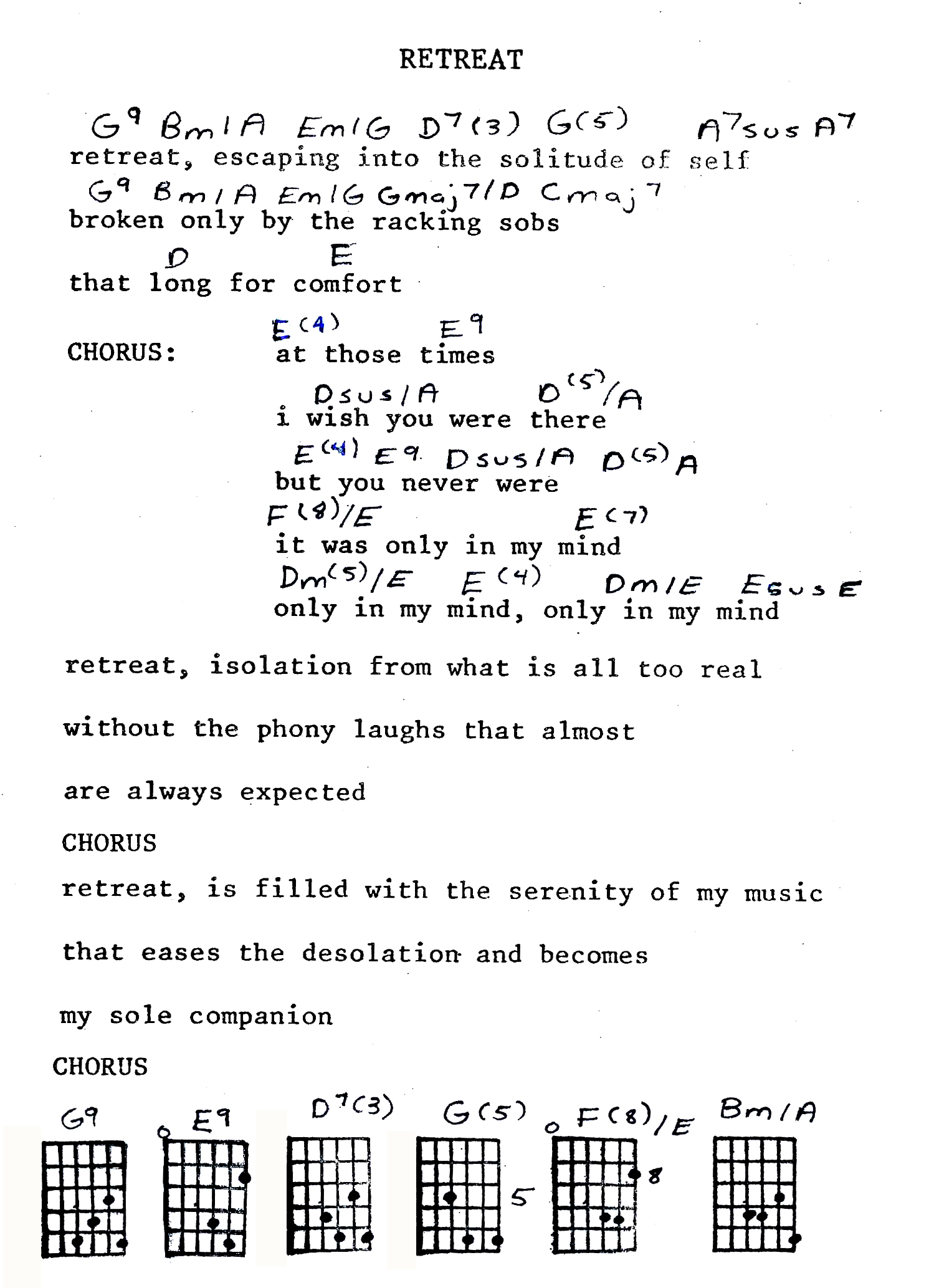I began with Retreat, and let the song slowly unfold and improve. I remembered the chorus melody, and allowed for a new melody and chord progression for the verses. I eliminated many extra words, as I could not remember how I used to sing the verses.