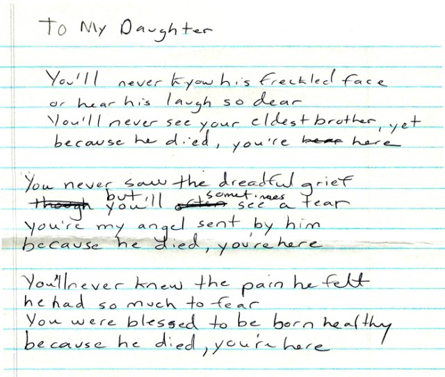 A poem I wrote after my daughter was born. She was born before it had been a year since Jason had died.
