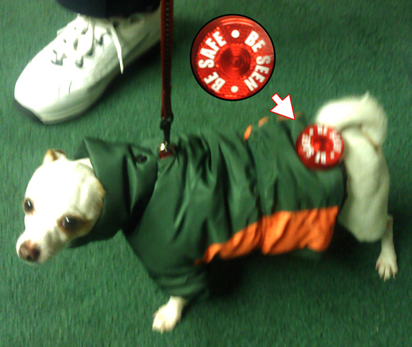 My husband’s latest Internet purchase; it lights up and flashes. Good thing it doesn’t say “Kick me!” When our dog is “underfoot” that happens sometimes!