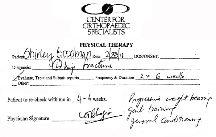 1. I received a prescription from my mother’s orthopedic doctor who delivered a “second opinion” My mom will be allowed to begin physical therapy and WALK! I was told my mother most definitely would never be allowed to walk again without surgery for her broken hip.