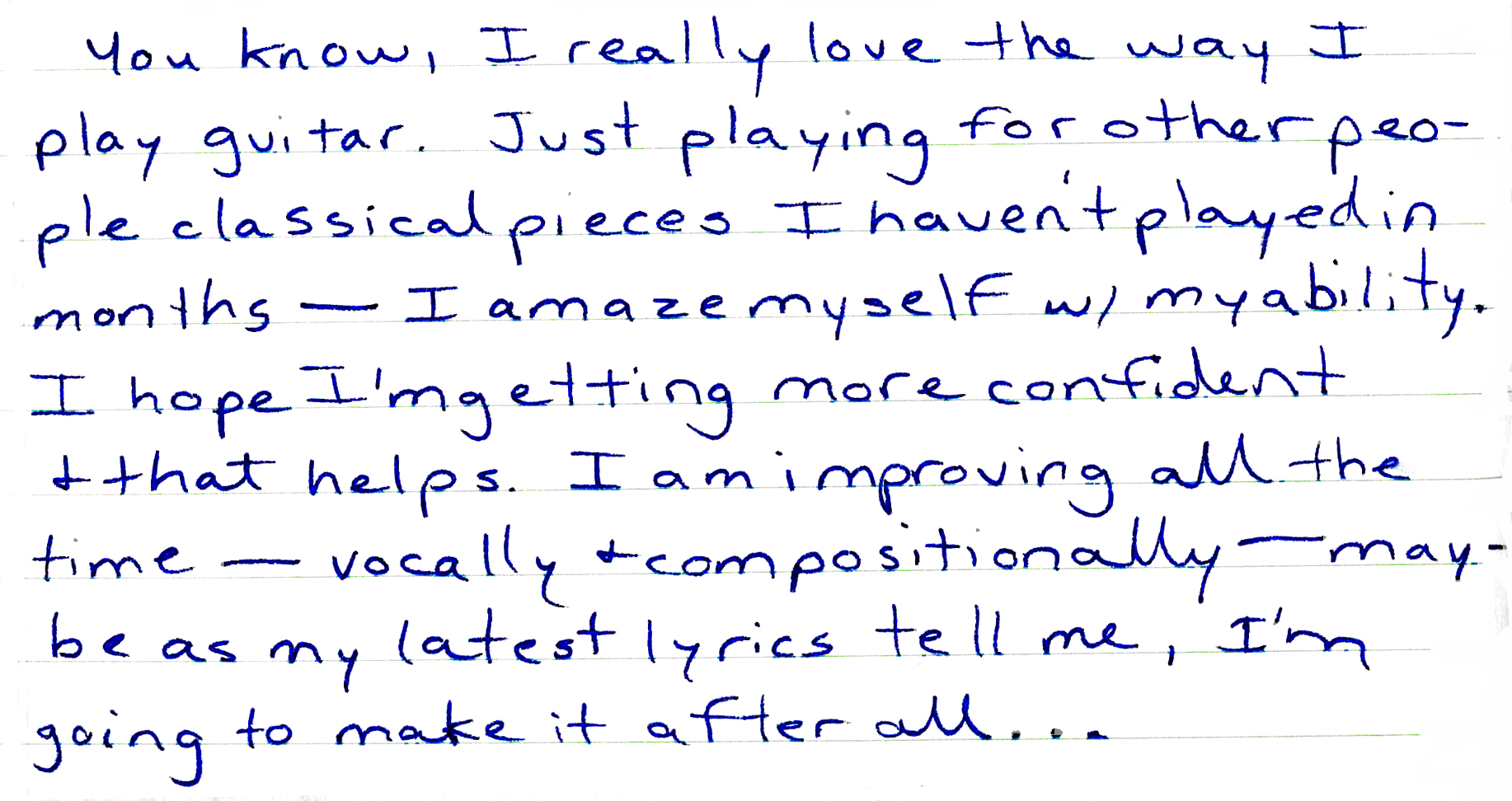 She thought the music might stay if she had a more beautiful guitar. Her devotion to art, which had stolen her musical passion, allowed for the money to buy a special treasure.