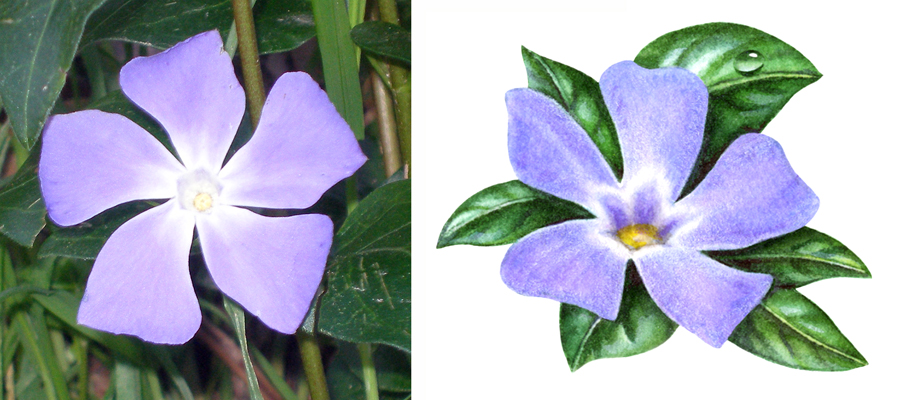 A periwinkle flower I photographed with a painting of one that I did for a Kirkland (Costco) vitamin supplement label several years ago.
