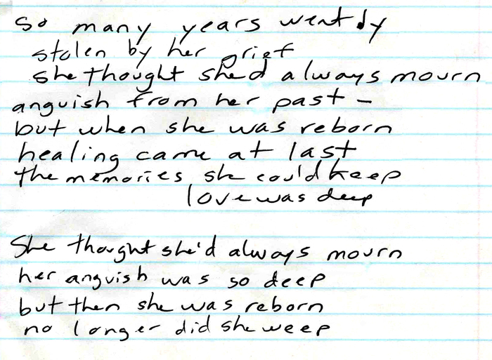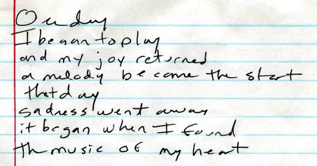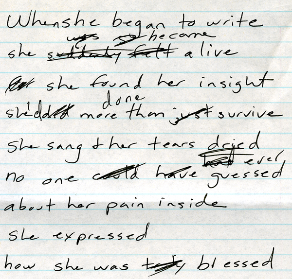 When I began writing my song, it was in “first person,” with “I” statements. I changed it to “her.” These lyrics scrawled are not the final ones.