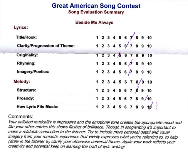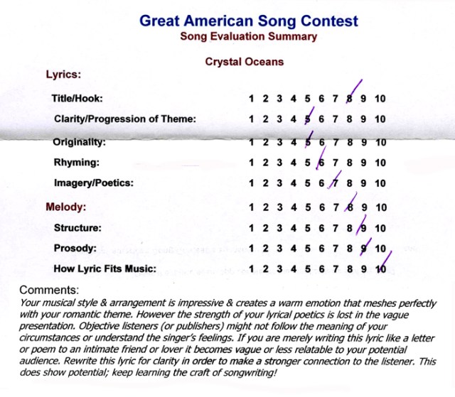 As I read the letter, I knew right away I hadn’t won. I admonished myself for allowing my “dream” to give me false hope. Each of my four songs was critiqued, and I read carefully what was written. I could feel the disappointment inside of me.