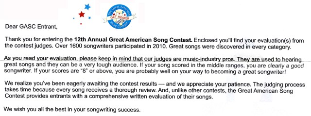 I opened my mail. There was a letter from a song contest I had entered. It had cost me $30 per song, and I had entered four of my songs.