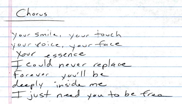 It was late at night. I worked on my song and incorporated the new chord Peaches had suggested. I rewrote the one lyric line to: