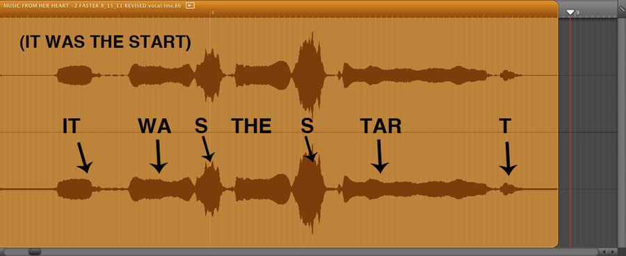 This is exactly how a vocal line looks. I listen closely to every line I sing in my songs. No more “pitchy stuff!” The “S” sound is a pain, especially if it is loud and sibilant (or hissy); visually they are oval with spikes.