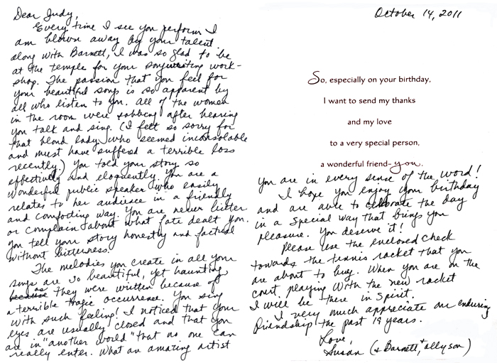 Every time I see you perform; I am blown away by your talent. I was so glad to be at the temple for your songwriting workshop. The passion that you feel for your beautiful songs is so apparent by all who listen to you. All of the women in the room were sobbing after hearing you talk and sing. You told your story so effectively and eloquently. You are a wonderful public speaker who easily relates to her audience in a friendly and comforting way. You are never bitter or complain about what fate dealt you. You tell your story honestly and factually without bitterness.