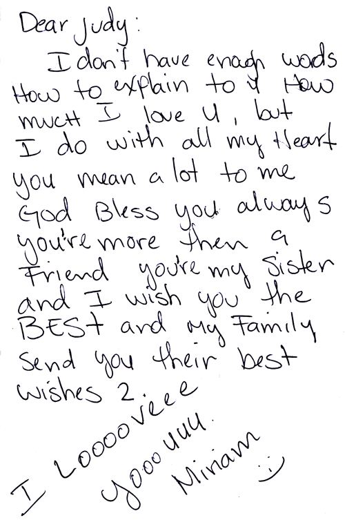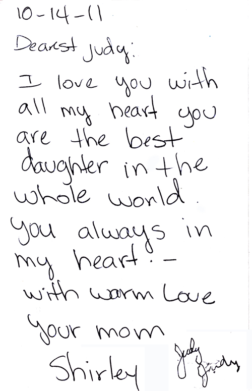 My mother dictated these words to Miriam. My mother signed it with “Judy, Judy” on the bottom right.