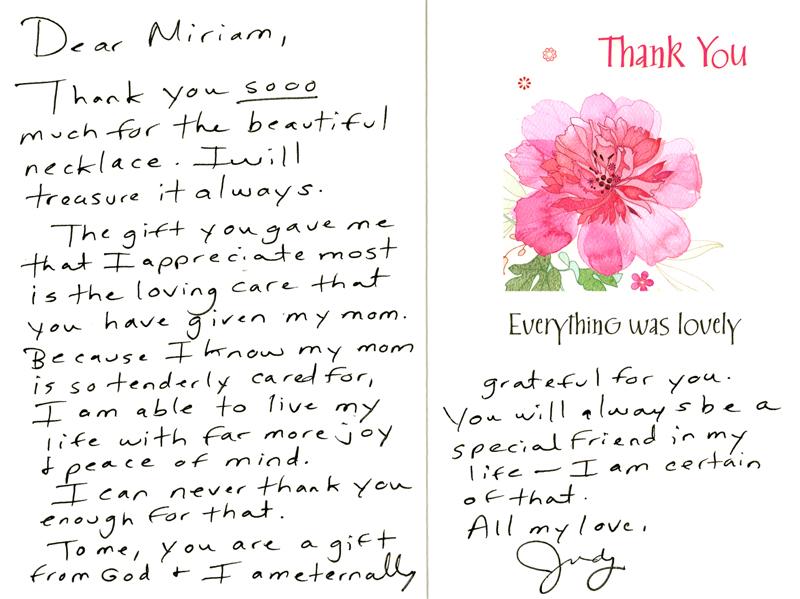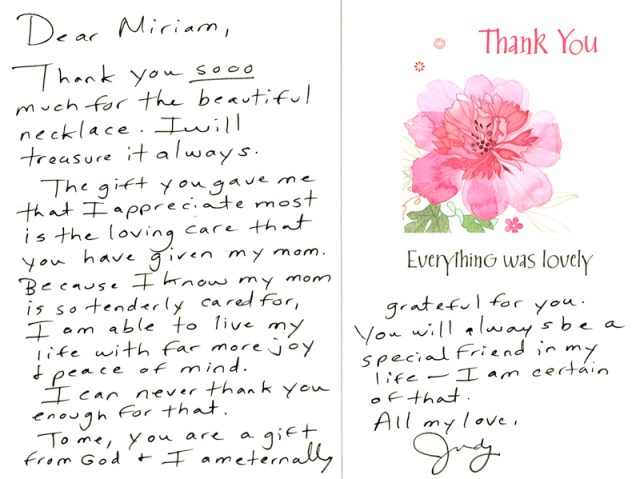 There were many distractions for me this past week. Some were wonderful, as I had beautiful moments catching up with my friends because of my birthday. I played tennis on the actual day and a group of my friends treated me to a wonderful lunch afterwards. The day after that, I went to lunch with my parents and celebrated with them. I received a necklace and two cards from my mother’s caregiver, Miriam. I treasured Miriam’s cards: She wrote one to me and then gave me a card dictated by my mother. I was so touched by her gesture.
