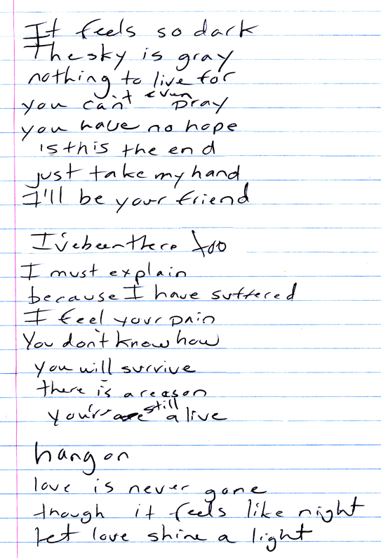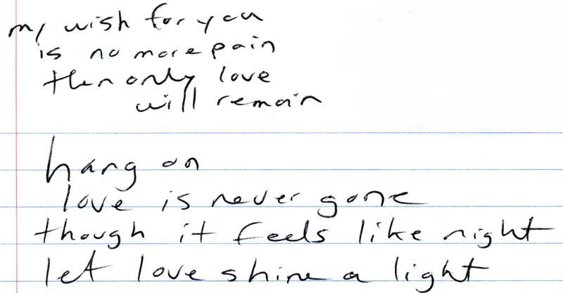 With my lyric line “one day, your pain will go away,” I realize I have no certainty about that. It is only a profound wish, but I believe having hope is definitely a start toward feeling better. Even though I used to believe my sorrow would never leave, I still want to share my experience and my music to offer any comfort that I can to others.