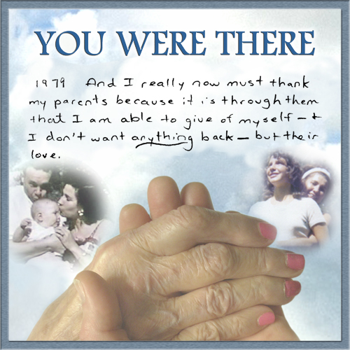 My song lyrics for “You Were There” flowed out easily from me as though they were already written. The lines of my song that touch me most, are the two that describe how I went from being the child to becoming the parent. With the transition of words “me” and “you, I first say: “You picked me up when I fell down,” and then I say: “I picked you up when you fell down.”