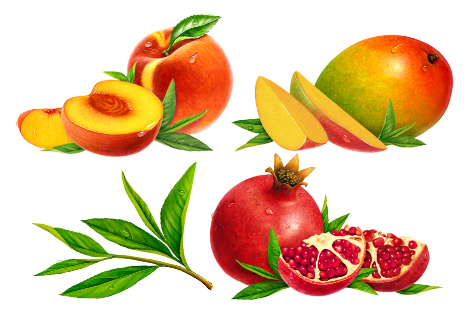 A recent job of mine. The illustrations are to be used on the labels of four different flavors of iced tea.