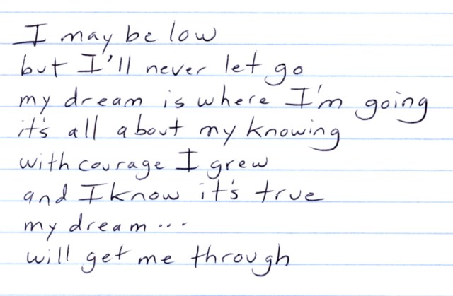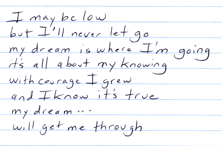 My songs are there to help me. I just composed a new one, which I’ve named “My Dream.” I plan to record it soon. If I didn’t have a dream, I wouldn’t be able to cope nearly as well. Hanging on is also applicable for me right now. I must remind myself to hang on through this tough time.