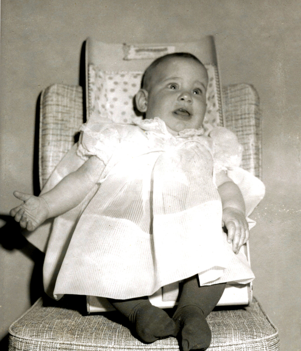 In this baby picture I am saying, “Please don’t tell me I’m going to grow up to be a 52-year-old woman who has cataracts and performs with a guitar. Oh my god, and living in the same place where I grew up on top of that!”